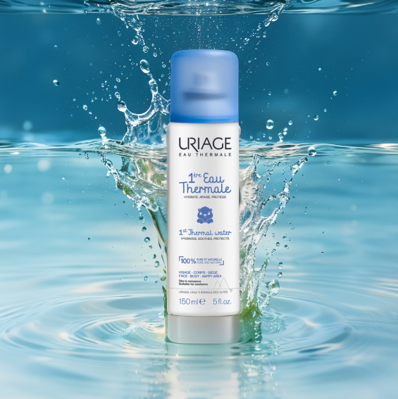 Agua termal 100 % pura de Uriage para bebé: hidrata, calma irritaciones y protege la barrera cutánea con oligoelementos como calcio, apta para rostro, cuerpo y mucosas. CAJA UN POCO DOBLADA