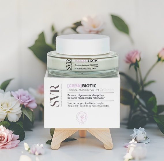 SVR [CERA] Biotic es un bálsamo regenerante de 50 ml que combina probióticos pasteurizados, vitamina C estabilizada, ácido hialurónico y ceramidas. Nutre, y rellena las arrugas. VTO ENE-26